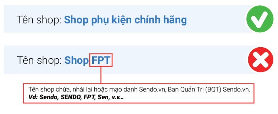 + Tên shop trùng hoặc nhái lại thương hiệu. Ví dụ: Shop FPT, Sendo