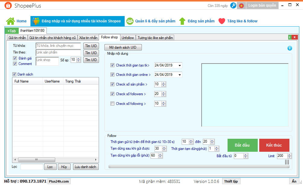 Như vậy, Plus24h giới thiệu phần mềm ShopPlus với tính năng “Follow Shop”; hỗ trợ bạn tìm kiếm và và tự động follow hàng loạt các shop bạn muốn.