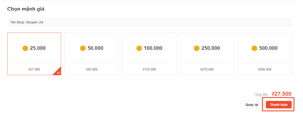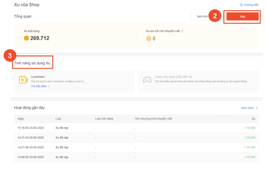 2. Hướng dẫn Top up Xu của Shop tại Kênh Người Bán và Ứng dụng