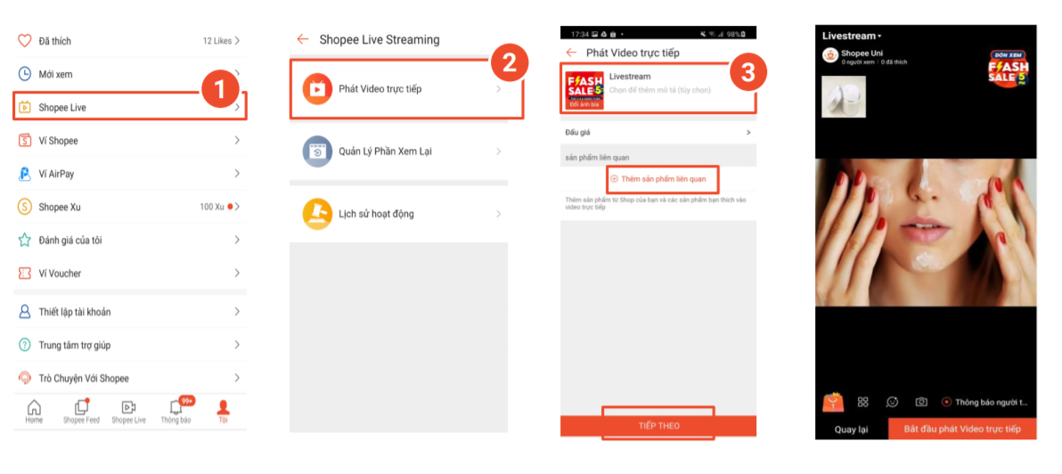 Bước 1: Truy cập Shopee Live qua trang Shop của tôi => Phát video trực tiếp => Livestream