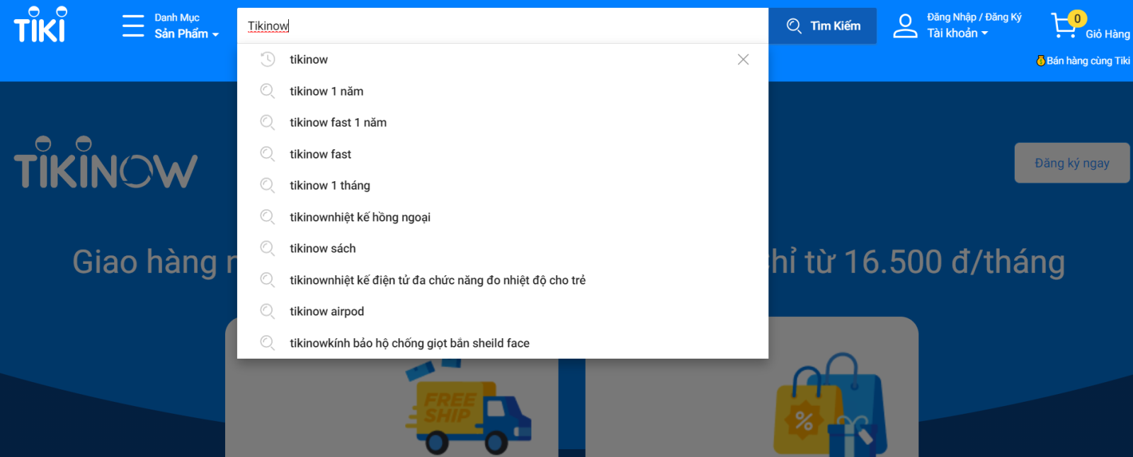 Bước 2: Tiếp theo nhập từ khóa gói dịch vụ TikiNow trên thanh tìm kiếm.