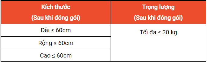 Yêu cầu về kích thước và trọng lượng của kiện hàng như sau