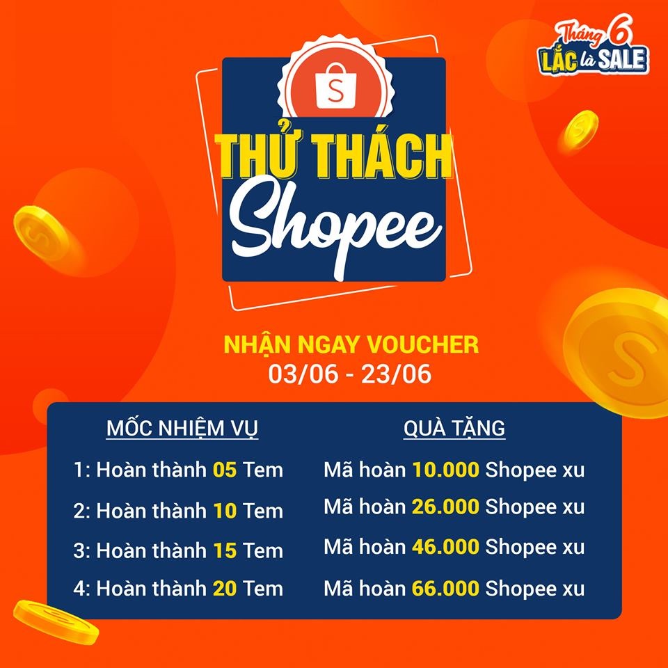 - Thử thách Shopee: Ra mắt từ ngày 03/06 – 23/06. Cách chơi là bạn THU THẬP TEM để nhận voucher từ Shopee. Trong thời gian chương trình, bạn hoàn thành 1 đơn hàng từ 250k thì nhận được 1 TEM. Sẽ có 4 mốc thử thách và voucher phần thưởng tương ứng như hình dưới.