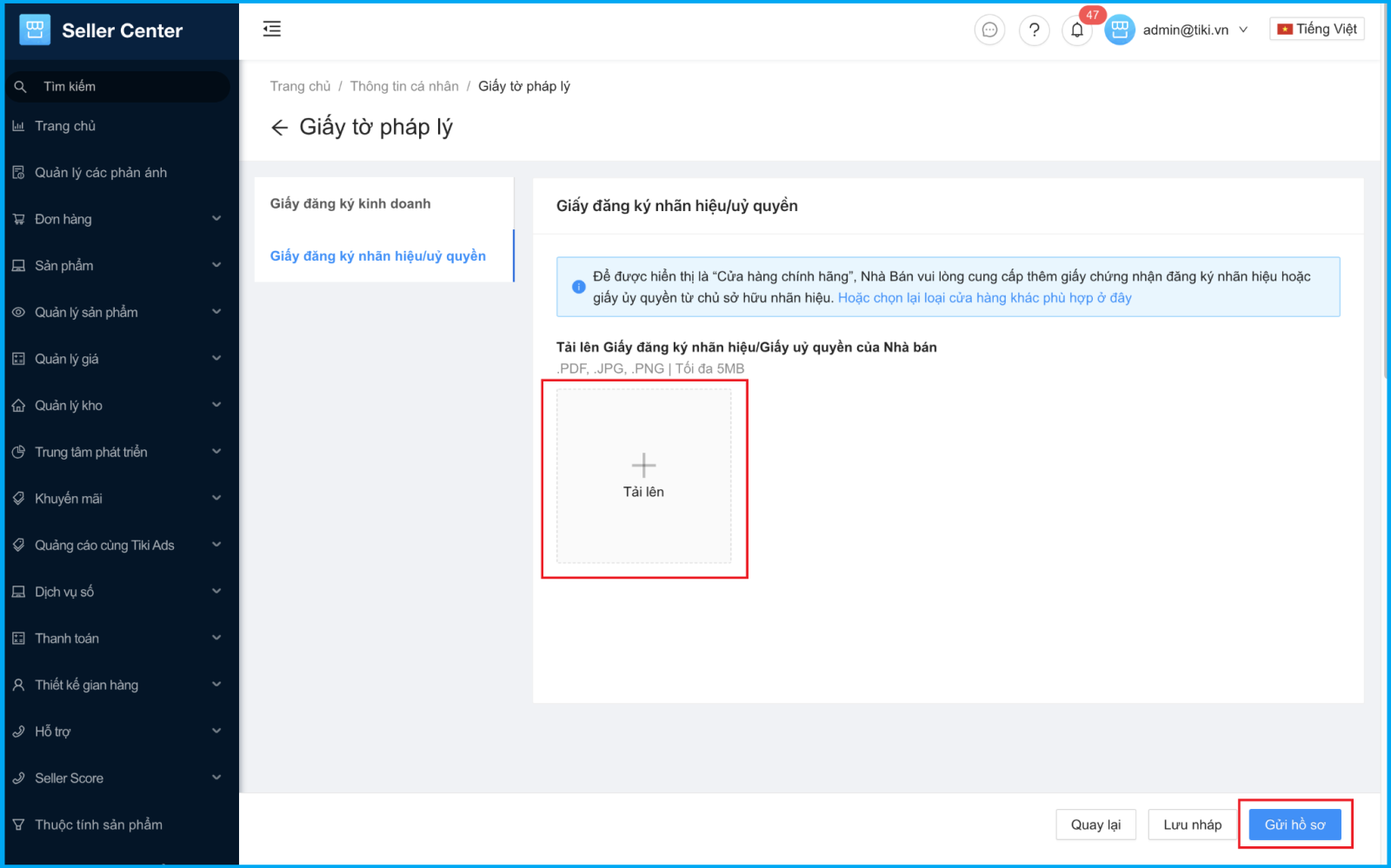 Chọn mục Gửi hồ sơ để hoàn tất thủ tục đăng ký và Gian hàng sẽ được chuyển chờ duyệt.