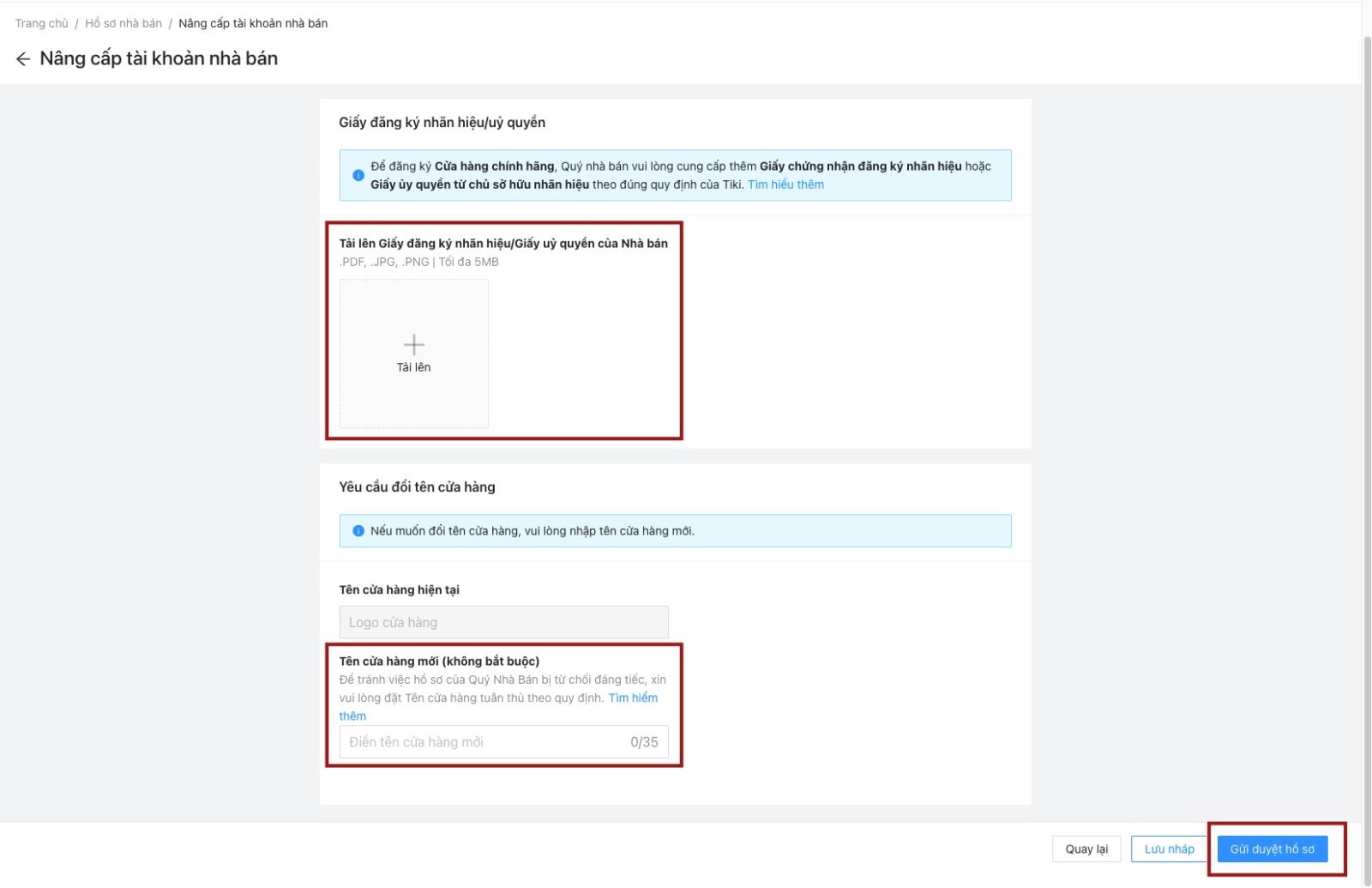 Nhà Bán cung cấp Giấy đăng ký nhãn hiệu/Giấy ủy quyền từ thương hiệu. Nếu muốn đổi tên gian hàng, Nhà Bán nhập vào mục Tên cửa hàng mới, sau đó bấm Gửi duyệt hồ sơ.