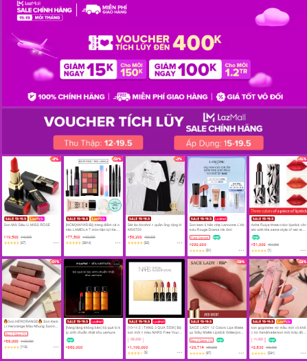 Trong mỗi dịp sale lớn Lazada thường tung ra các mã giảm siêu khủng cho toàn mặt hàng trên sàn. Ví dụ siêu sale hàng hiệu giảm giá đến 50% hoặc áp dụng cho tất cả sản phẩm. Bên cạnh đó kèm theo Voucher Freeship cho các đơn hàng 0 đồng hay các đơn có giá trị tối thiểu là bao nhiêu. Khi đó người dùng sẽ được miễn phí vận chuyển và được nhận ưu đãi khủng trong những ngày bão sale.