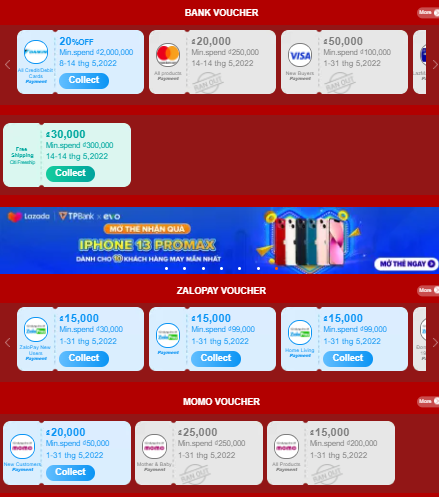 Ngoài những voucher được Lazada cung cấp, bạn có thể săn các mã giảm giá từ các đối tác của Lazada ( đối tác từ ngân hàng). Khi bạn thanh toán đơn hàng online của ngân hàng đối tác sẽ nhận được các mã voucher hấp dẫn. Ngoài ra các ứng dụng thanh toán online qua Ví Zalo Pay hoặc MOMO bạn cũng có thể sử dụng.