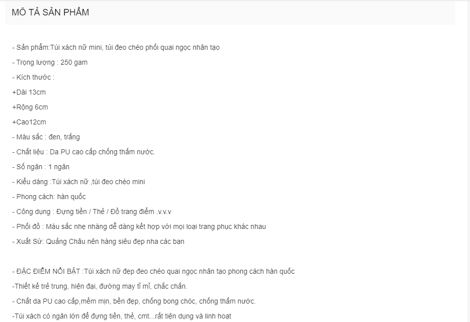 Nếu hình ảnh giúp khách hàng hình dung được sơ qua về sản phẩm thì những mô tả sẽ giúp khách hàng hiểu rõ hơn về sản phẩm đó từ đó dễ dàng tiếp cận và nhanh chóng quyết định mua hàng. Do đó, mô tả cũng là yếu tố để tăng tỷ lệ chuyển đổi hiệu quả cho shop.