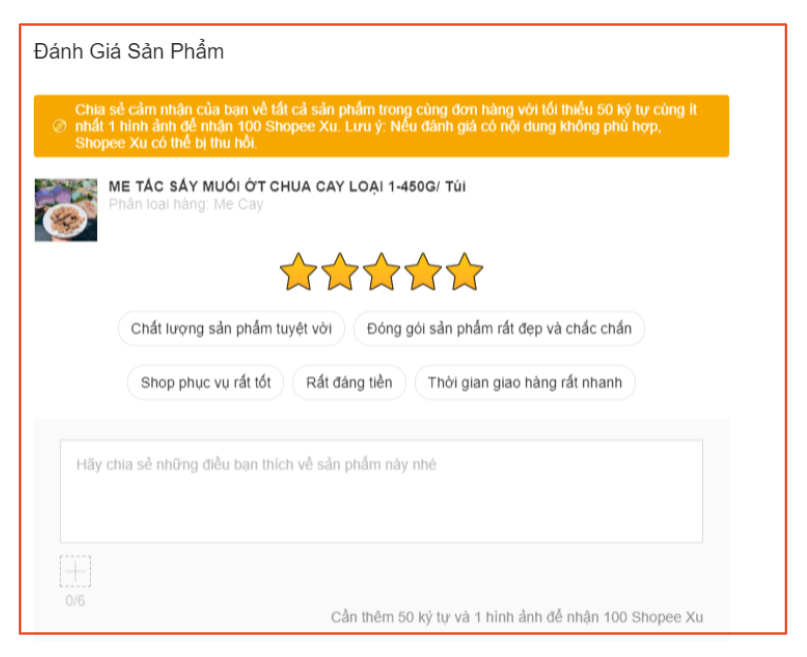 Đánh giá sản phẩm có thể dao động từ 1-5 sao và đánh giá 5 sao là tốt nhất. Shopee luôn khuyến khích người mua có những đánh giá chất lượng bao gồm bình luận và hình ảnh bằng Shopee xu.