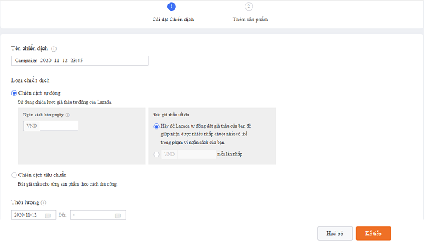 Bước 3: Chọn Sản phẩm tài trợ và thiết lập Chiến dịch mới
