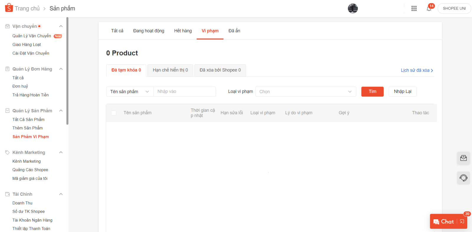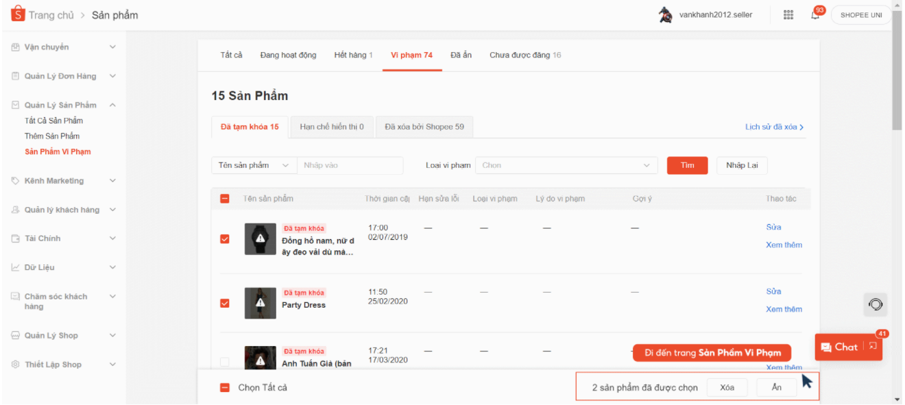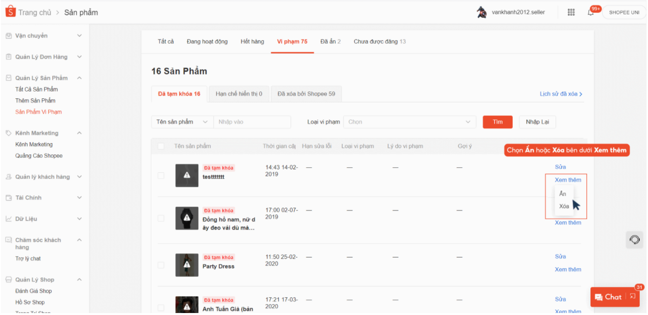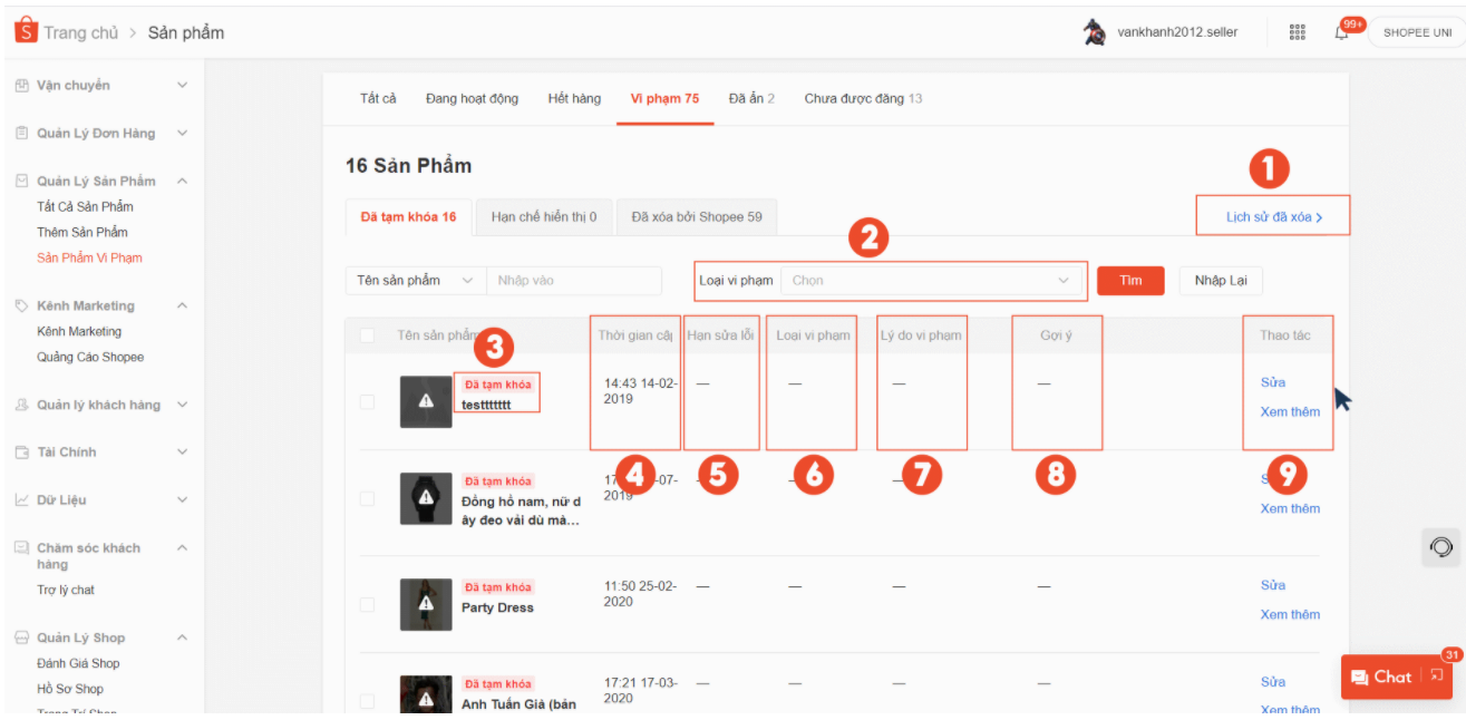 Để xem những sản phẩm bị khóa của shop, bạn hãy truy cập vào Kênh người bán, chọn Sản phẩm vi phạm tại mục Quản lý sản phẩm là xong.