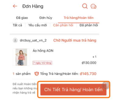 Bước 2: Tiếp theo vào mục Cần phản hồi >> Chọn đơn hàng cần đề xuất hoàn tiền ngay cho người mua >> Click chi tiết Trả hàng/hoàn tiền.