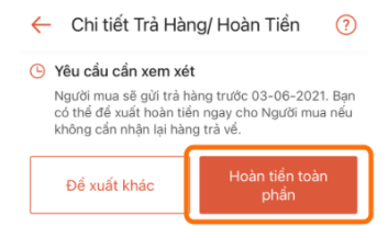 + Trường hợp người mua từ chối / không phản hồi đề xuất của Shop, người mua vẫn sẽ được tiếp tục gửi trả hàng theo quy trình trả hàng / hoàn tiền của Shopee.