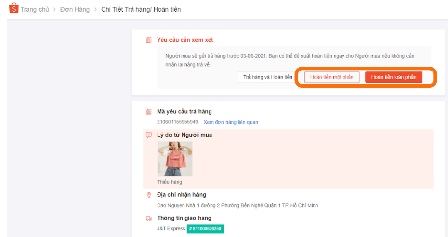 + Nếu hoàn tiền một phần bạn muốn hoàn cho khách một số tiền phù hợp để khách không cần trả lại hàng. Ngoài ra cần nhập số tiền hoàn cho khách hàng có thể một nửa hoàn 80%. Bạn cần liên lạc với người mua để thương lượng số tiền cần hoàn trả khi chọn hoàn tiền một phần.