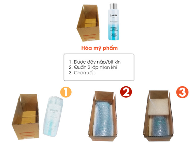 - Bọc kín sản phẩm bằng lớp nilon khí, đối với mỹ phẩm cần cố định nắp chai như trên.