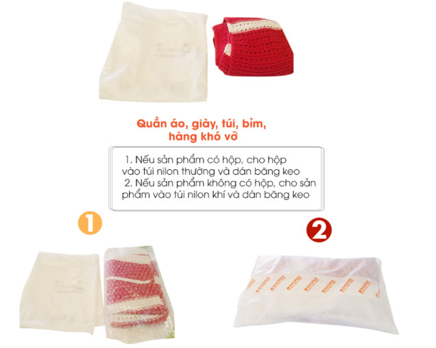 - Bọc kín sản phẩm bằng 1-2 lớp nilon khí, sau đó bỏ vào túi nilon thường và dùng băng keo dán kín gói hàng.