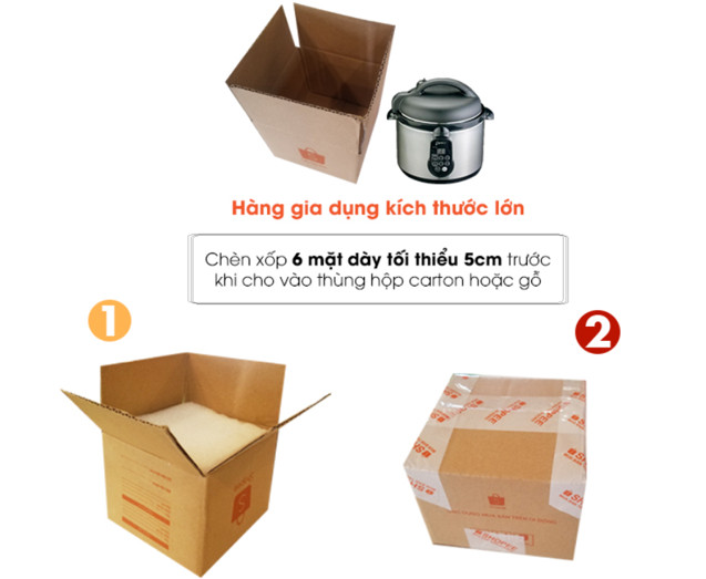 - Để đảm báo về mặt chống sốc cho sản phẩm cần phải chèn thêm lớp xốp dày từ 3-5cm đủ 6 mặt hộp.