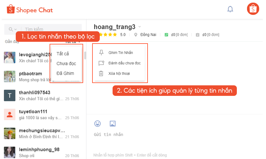 - Bộ lọc tin nhắn: Tính năng lọc tin nhắn cho phép phân loại các cuộc trò chuyện theo tiêu chí người bán cần và có thể chọn từ các tùy chọn sau: Tất cả; Chưa đọc và Đã ghim