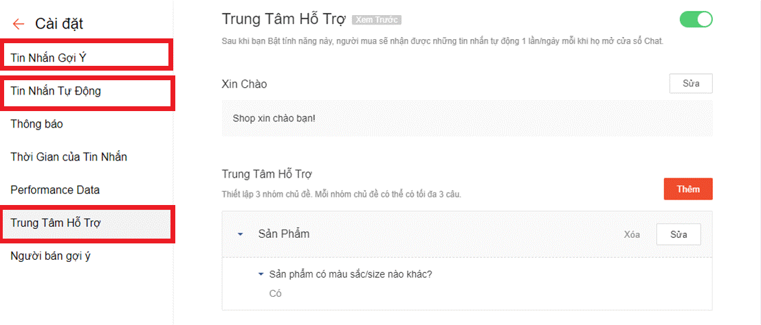 Trung Tâm Hỗ Trợ là một tính năng giúp Người bán gửi các câu trả lời đã được lưu trước cho những câu hỏi thường gặp. Với tính năng này Người bán có thể thêm tối đa ba chủ đề mà người mua thường quan tâm ở đây và mỗi chủ đề, có thể thêm tối đa 3 câu hỏi thường gặp. Điều này sẽ giúp người mua tìm thấy câu trả lời của họ nhanh chóng khi có thắc mắc.