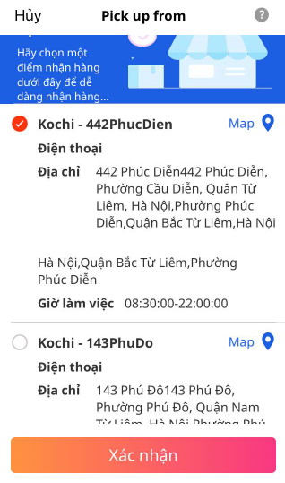 Ở mục địa chỉ nhận hàng, bạn chọn địa chỉ nhận hàng của bạn. Hệ thống sẽ tự động gợi ý cho bạn những Điểm Lấy Hàng gần với địa chỉ mà bạn chọn. Để xem danh sách và chọn địa điểm lấy hàng gần nhất bạn click vào ô Dễ dàng lấy hàng với các điểm lấy hàng sau. Tiếp theo bấm “xác nhận”