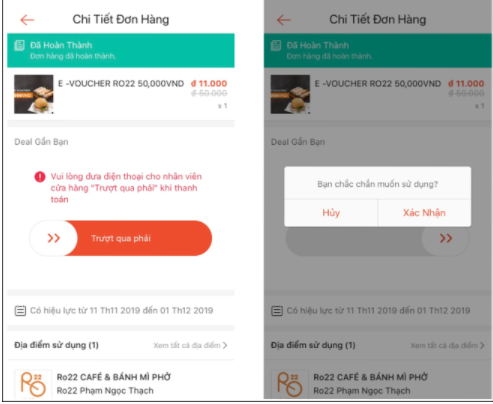 E-Voucher đã được trượt qua phải và bấm “Xác nhận” đồng nghĩa với việc đã sử dụng và không thể khôi phục dưới mọi hình thức