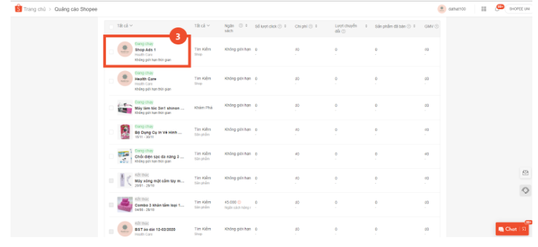 Bước 3: Ở mục Danh sách tất cả quảng cáo, chọn sản phẩm cần tắt Quảng cáo.