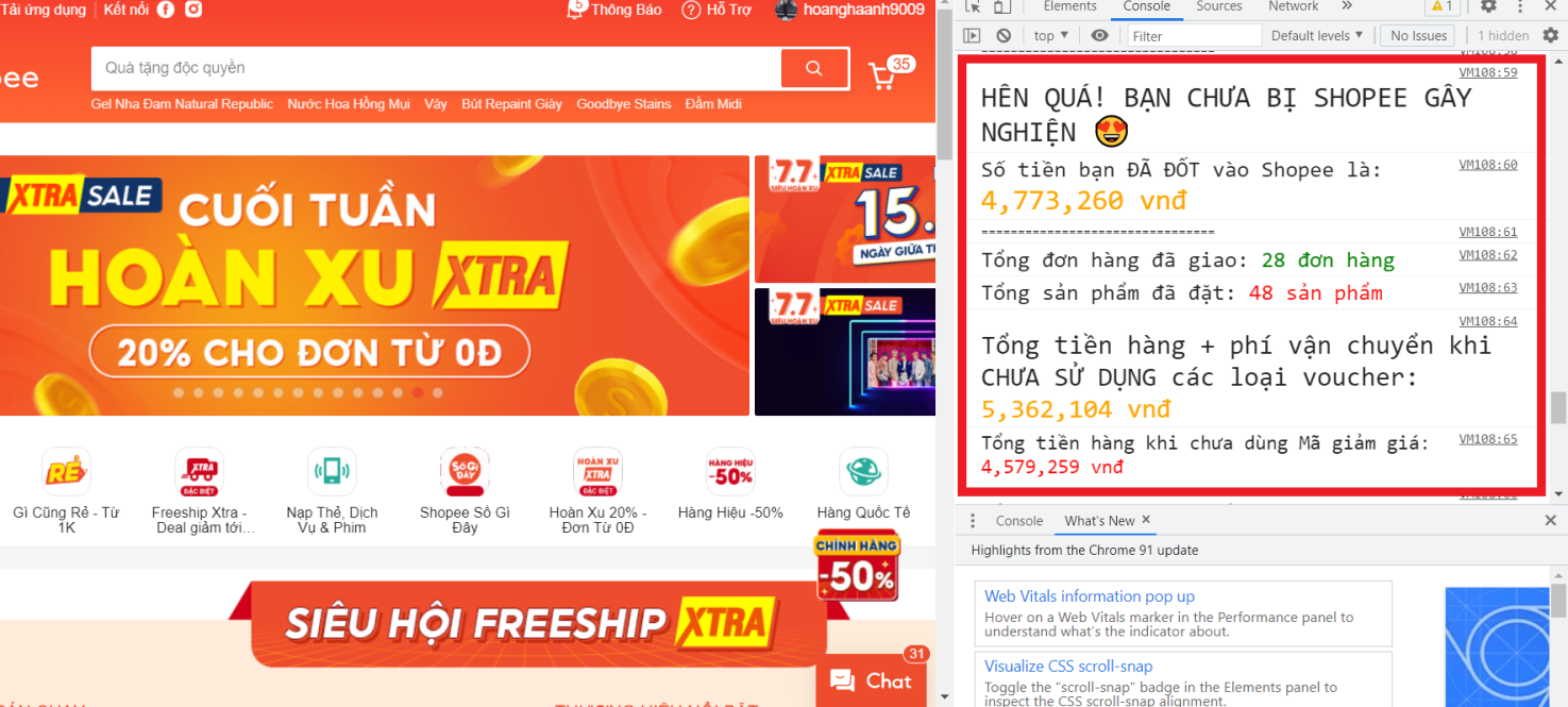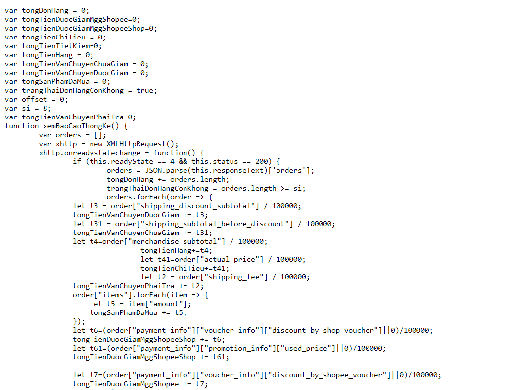 Bước 3: Copy tập lệnh kiểm tra thống kê đặt hàng Shopee