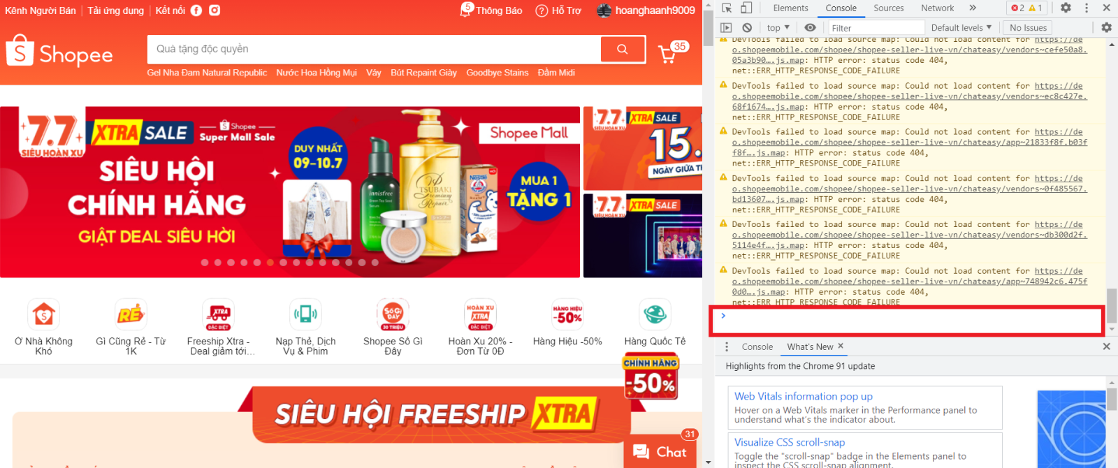 Trên website https://shopee.vn, bạn nhấn phím F12 để mở mục Console của trang web.