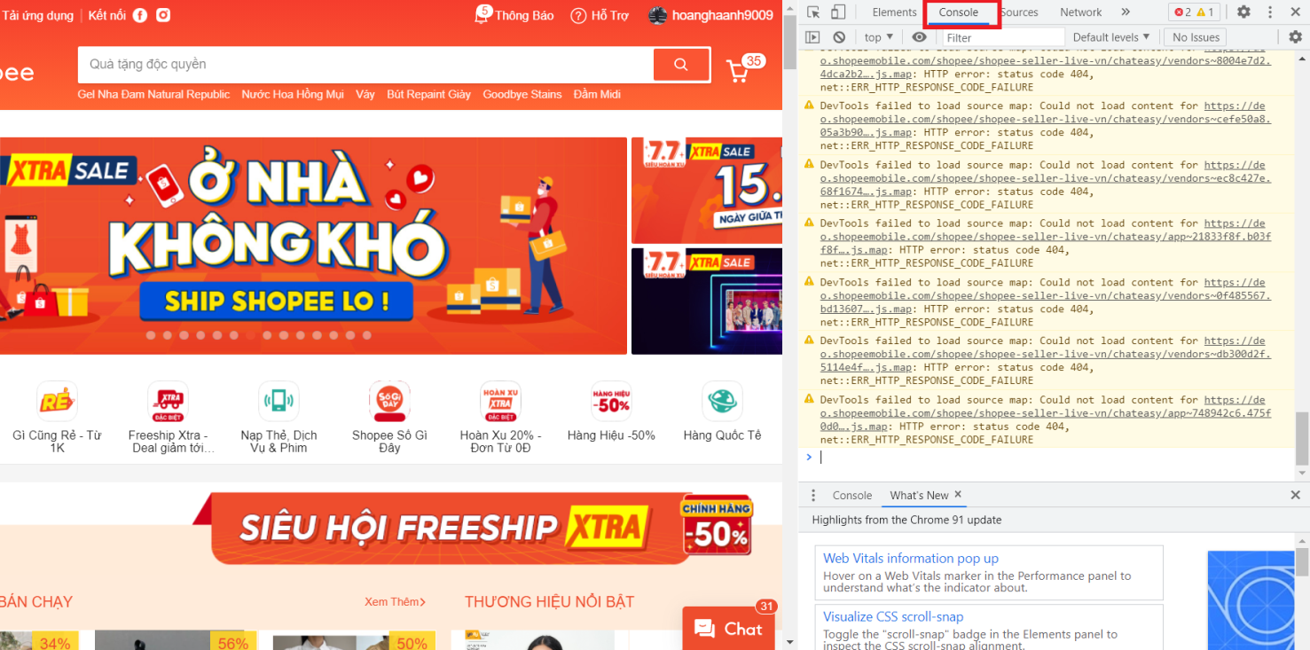 Bước 2: Mở mục console của Shopee