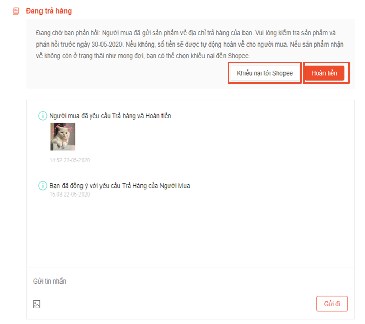 Lưu ý: Trong vòng 2 ngày kể từ khi Người mua cập nhật thông tin trả hàng: Nếu chưa nhận được hàng / hàng trả về không nguyên vẹn: Bấm Khiếu nại, và chờ kết quả từ Shopee. Hoặc người mua đã nhận được hàng và không có vấn đề phát sinh thì bấm Hoàn tiền để xác nhận hoàn tiền cho người mua.
