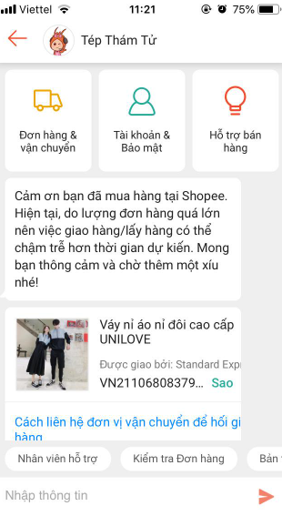 Khác với trường hợp ở trên đơn hàng đã được giao nhưng chưa được cập nhật trên hệ thống. Trạng thái giao hàng không thay đổi sau 24h bạn liên hệ tổng đài của shopee hoặc nhân viên chăm sóc khách hàng Shopee để được hỗ trợ.