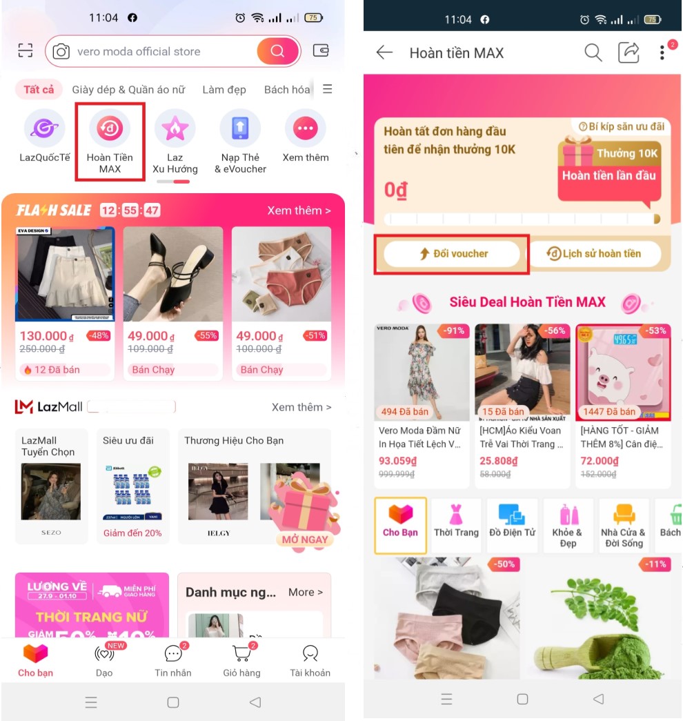 Bước 3: Sau khi đã thu thập được tiền hoàn, bạn hãy truy cập vào mục Hoàn tiền Max ngay trên trang chủ của Lazada. Nhấn nút Đổi voucher để tiến hành quy đổi số dư Hoàn tiền thành voucher.