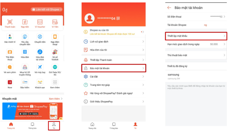 Bước 2: Chọn bảo mật tài khoản >> Thiết lập mật khẩu.