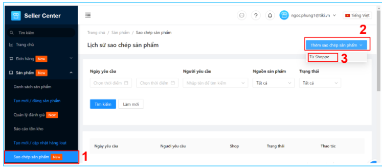 Bước 1: Đầu tiên bạn truy cập vào trang Tiki Seller Center, Nhà bán bấm chọn mục Sản phẩm >> Sao chép sản phẩm >> Thêm sao chép sản phẩm >> Từ Shopee.