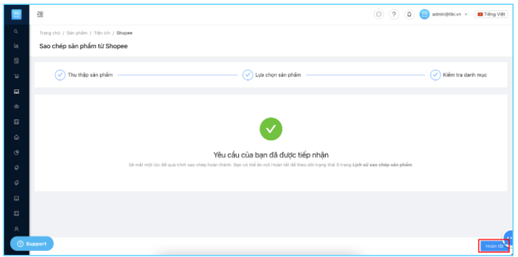 Màn hình hiển thị yêu cầu đã được tiếp nhận, Nhà bán nhấn Hoàn tất để quay lại màn hình Lịch sử sao chép sản phẩm để theo dõi kết quả.