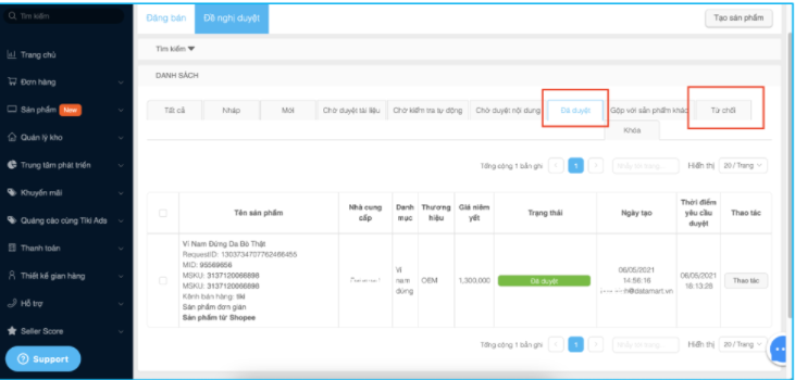 Đối với các sản phẩm được duyệt sẽ nằm trong Danh sách sản phẩm. Nhà Bán có thể kiểm tra thông tin tồn kho, điều chỉnh Trạng thái sản phẩm Bật/Tắt để sẵn sàng kinh doanh các sản phẩm này. Còn đối với các sản phẩm bị Từ chối, Nhà Bán bấm xem chi tiết Lý do từ chối của các sản phẩm trong tab Từ chối, cập nhật thông tin theo hướng dẫn và bấm Yêu cầu duyệt thêm lần nữa.