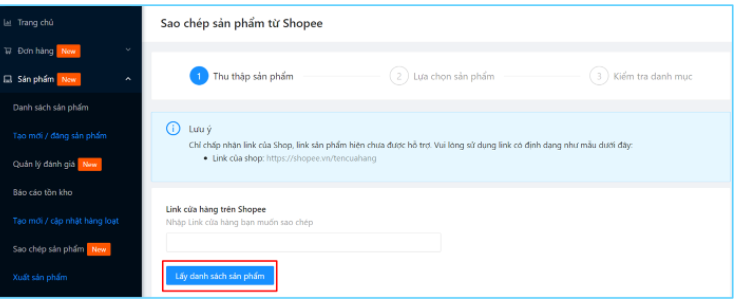 Bước 2: Tiếp theo nhập link cửa hàng trên Shopee và bấm Lấy danh sách sản phẩm. Sau đó hệ thống hiện kết quả như hình bên dưới. Bạn nhấn Tiếp tục.