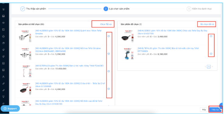 Nhà bán có thể Chọn hoặc Bỏ chọn Tất cả sản phẩm. Hoặc có thể nhấn (+) / ( – ) để chọn hoặc bỏ chọn từng sản phẩm.