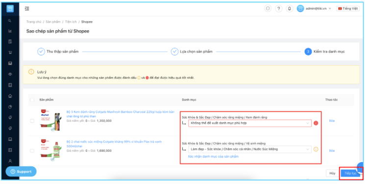 Tại cột Danh mục, bạn kiểm tra các sản phẩm có dấu cảnh báo ⚠️ ❗ và chọn lại đúng danh mục. Tại đây bạn có thể chọn nhiều sản phẩm để Xóa hàng loạt hoặc Cập nhật danh mục hàng loạt >> Nhấn Tiếp tục.