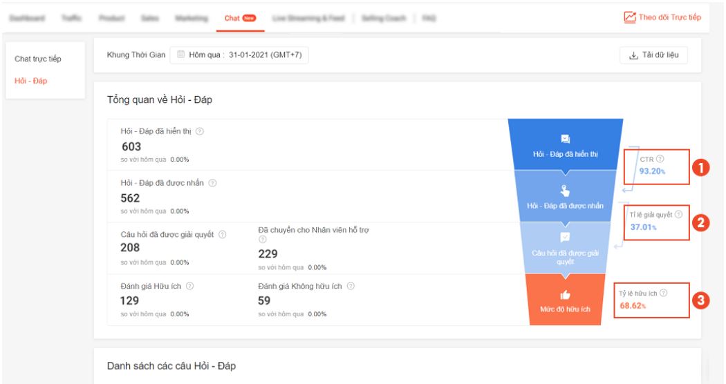 Cũng giống như phần chat trực tiếp ở mục Hỏi – Đáp bạn cũng sẽ thấy được tổng quan hiệu quả hoạt động của chat của shop mình thông quan các chỉ số quan trọng sau: