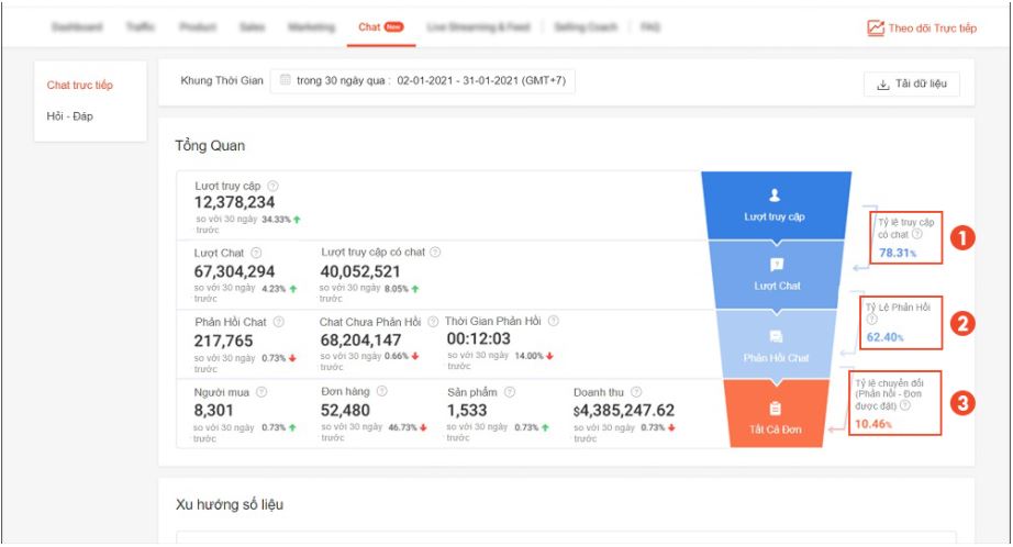 Mục chat trực tiếp là những thông tin chi tiết về tương tác của bạn với người Mmua như Lượt Chat, Lượt truy cập có chat, Phản hồi Chat và Chat Chưa Phản Hồi.