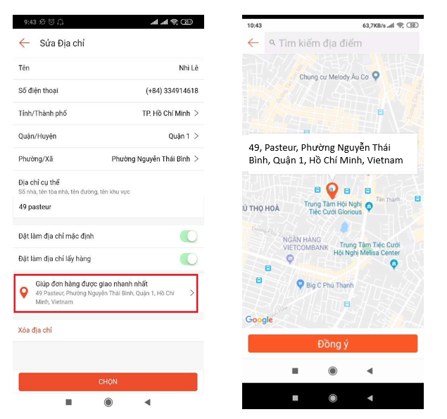 Bước 1 : Vào Thiết lập tài khoản > Địa chỉ > Sửa địa chỉ > Giúp đơn hàng được giao nhanh nhất > Chọn ví trí trên bản đồ hoặc nhập Địa chỉ lấy hàng của Shop để giúp NowShip định vị.