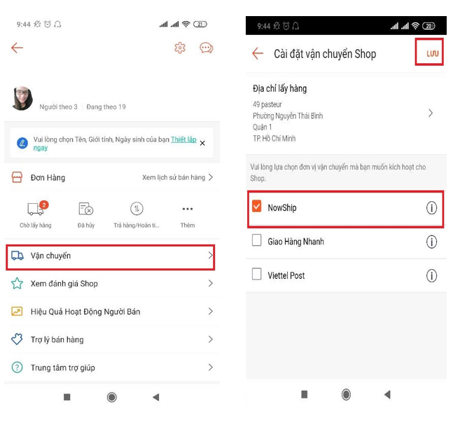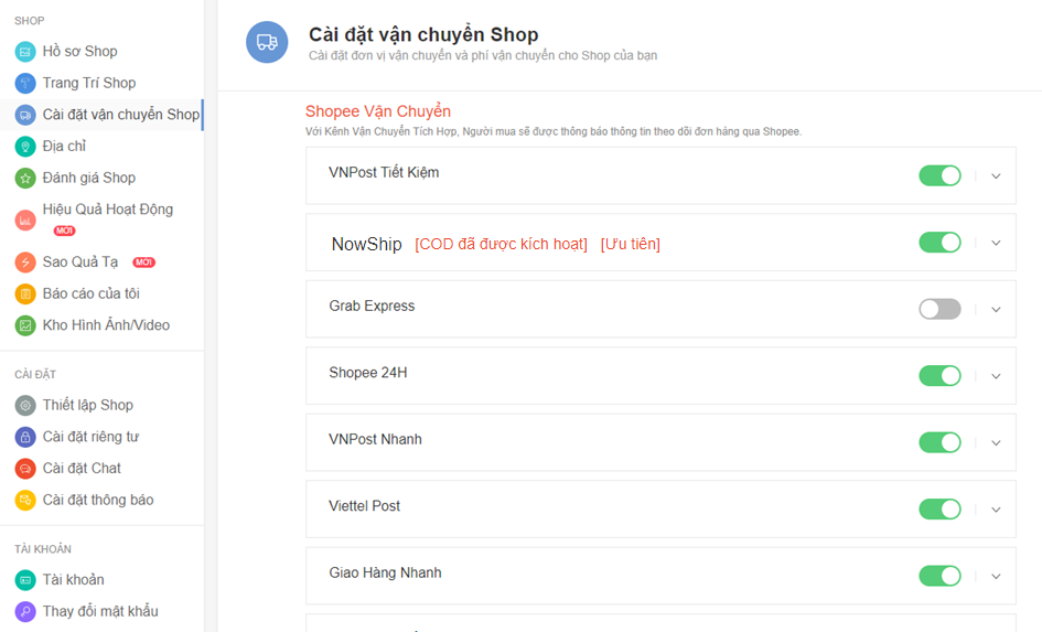 Bước 2 : Vào Cài đặt vận chuyển Shop > kích hoạt NowShip.