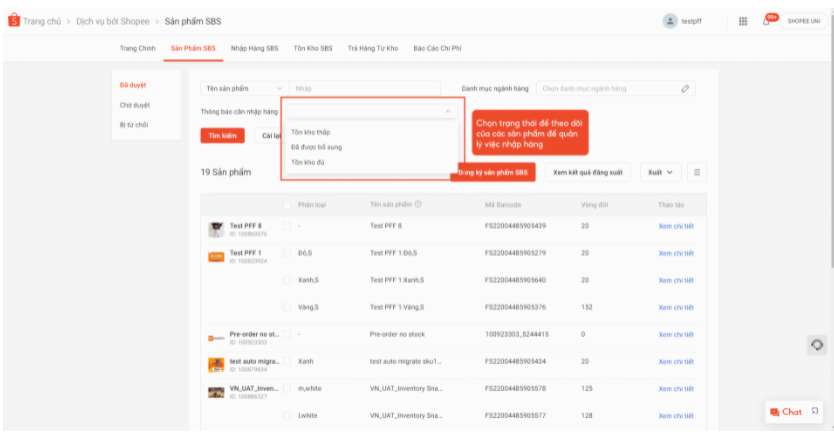 Bên cạnh đó, Người bán còn có thể theo dõi trạng thái của các sản phẩm để quản lý việc yêu cầu nhập hàng gồm Tồn kho thấp, Đã được bổ sung hoặc Tồn kho đủ.