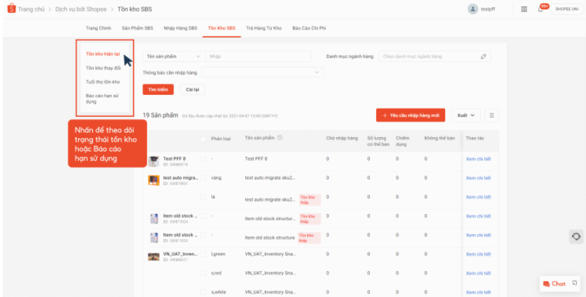 Tại Tồn kho SBS, người bán có thể theo trạng thái tồn kho tại 3 mục: