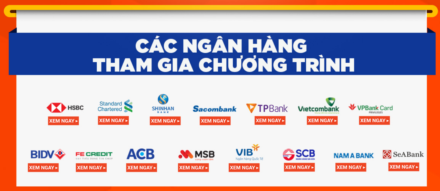 Chương trình Trả góp lãi suất 0% áp dụng cho các chủ thẻ tín dụng Visa/Mastercard/JCB/American Express (AMEX) thuộc danh sách các ngân hàng tham gia chương trình.