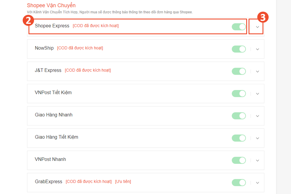 Bước 2: Gạt nút xanh để kích hoạt kênh Shopee Express và chọn mũi tên để xem thêm chi tiết về kênh vận chuyển và xem thêm thiết lập khác