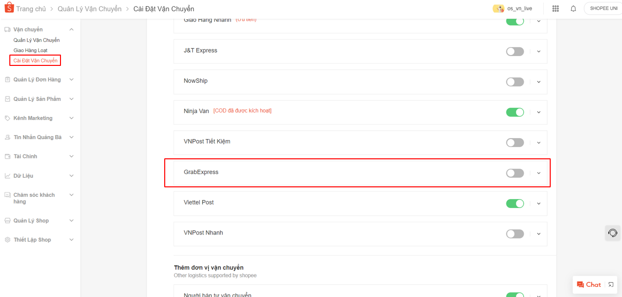 Bước 2: Vào Cài đặt vận chuyển Shop => kích hoạt GrabExpress.
