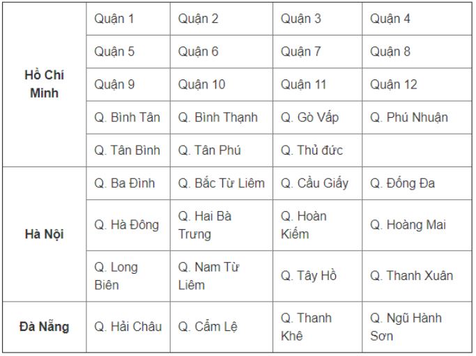 Từ ngày 12/09/2019, GrabExpress sẽ bắt đầu triển khai dịch vụ giao hàng trên Shopee dành cho Người bán - Người mua cùng thuộc 1 số khu vực quận/huyện thuộc thành phố Hồ Chí Minh, Hà Nội và Đà Nẵng như sau: