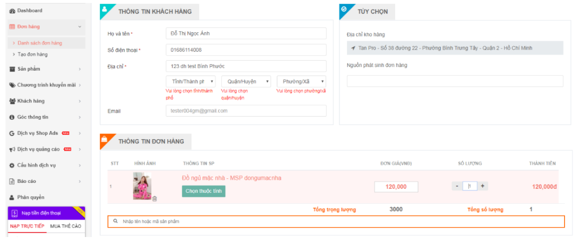 Nhấn “tạo đơn hàng” tính năng sẽ tự động chuyển qua màn hình “Tạo đơn hàng”
